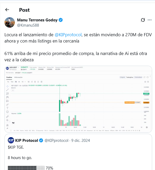Ese día, a las 7:21 de la mañana, Terrones Godoy recibió un depósito de 6,7 millones de tokens llamados $KIP. Dos minutos después comenzó a venderlos. Pero fue a partir de las 12:24 hs que se empezó a promover desde las redes sociales, con el apoyo de KIP Protocol (la misma que después suministraría $Libra).