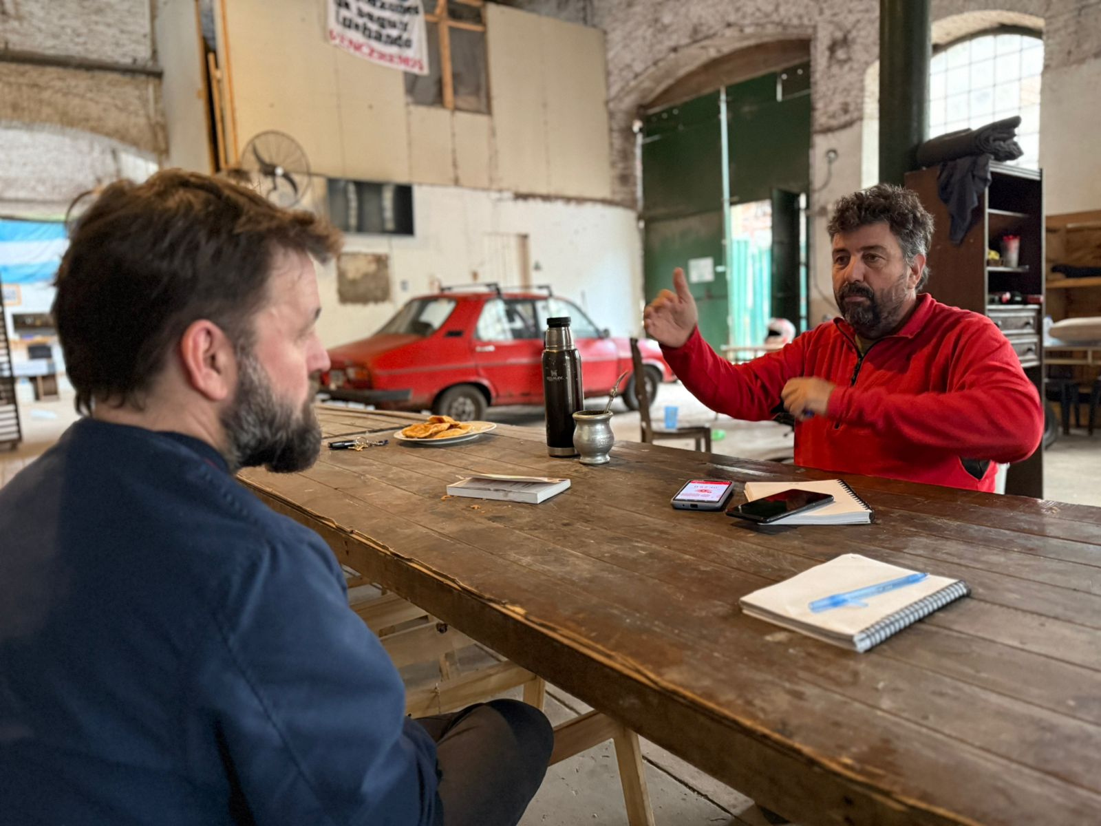Es una mañana de lluvia intensa. Camiones y camionetas de la organización están estacionados debajo de uno de los tres galpones, el que aún no pudieron techar, y donde el contrapiso está completamente inundado. El galpón en que nos reunimos para conversar no se inunda. Estamos bien. Tomamos mate y Tony, uno de los muchachos que amasa pizzas para vender, nos trae tortas fritas y se vuelve a su cocina a seguir produciendo. Solo el ruido de la lluvia contra la chapa del tinglado y unos galgos grises de pelo largo que andan por ahí dando vueltas y nos hacen la seguridad son testigos de la escena.